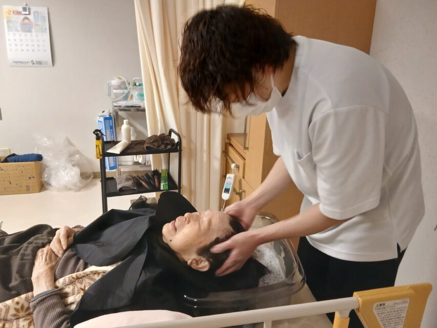 座位を保つのが難しい方など施設で取り入れている理容サービスでは対応しきれない方の身だしなみを、介護のプロ(介護福祉士)であり、美容のプロ(美容師)である職員ならば、「私もきれいにしたいわ…」とのご希望にこたえられるのではと